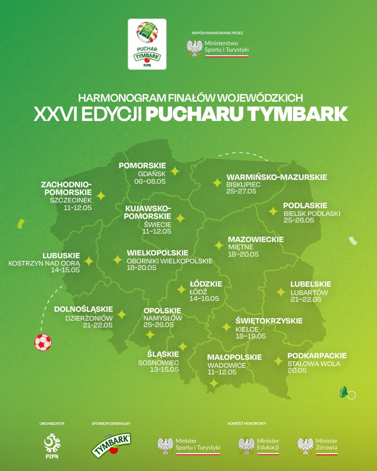 Etap wojewódzki XXVI edycji Pucharu Tymbark przyciągnie na boiska w całej Polsce ponad 20 tysięcy dziewczynek i chłopców – największe piłkarskie talenty w kategoriach U-8, U-10 i U-12. Rywalizacja rozpocznie się 6 maja w województwie pomorskim – na boiskach w Gdańsku zobaczymy dziewczęta i chłopców z kat. U-12. Zmagania na etapie wojewódzkim potrwają do 27 maja, kiedy zostaną rozegrane ostatnie spotkania w województwie warmińsko-mazurskim.