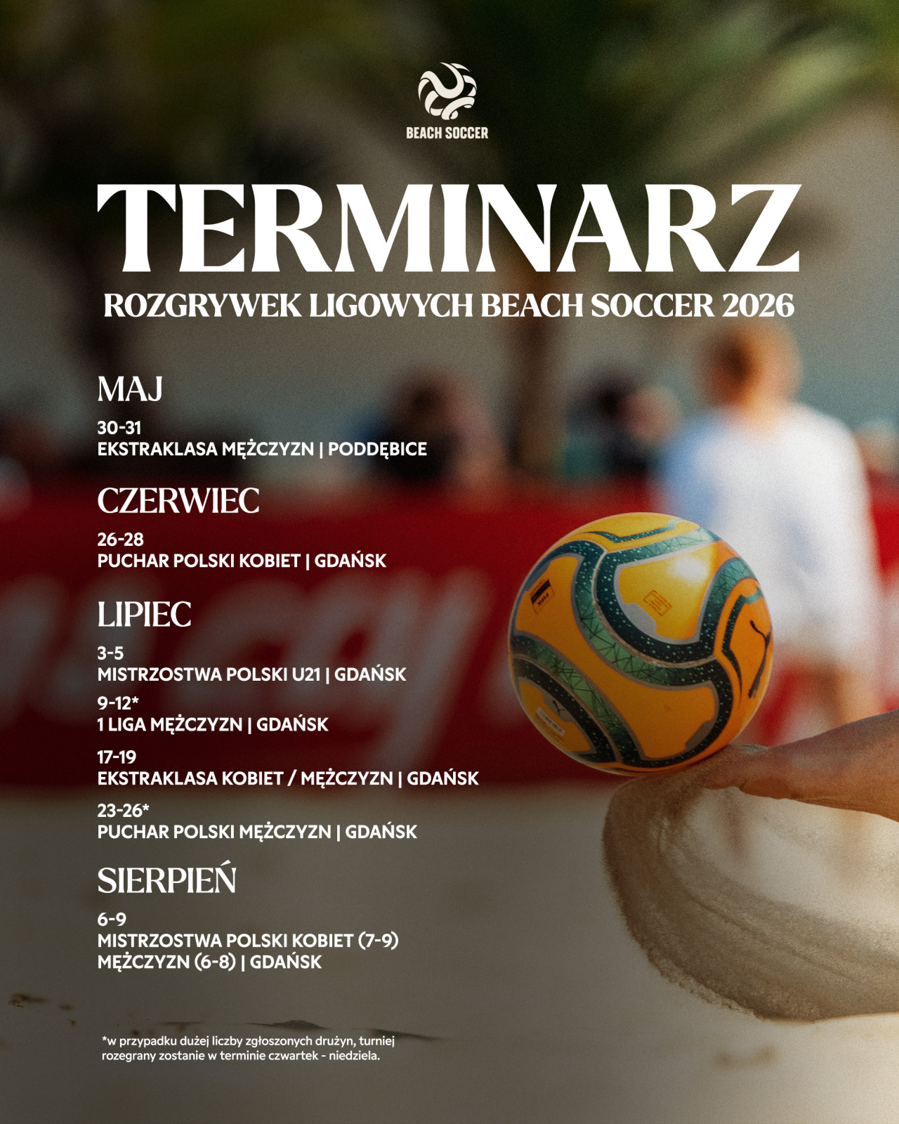 W załączniku publikujemy formularz zgłoszeniowy rozgrywek piłki nożnej plażowej na sezon 2026. Przedstawiamy również terminarz oraz regulamin.