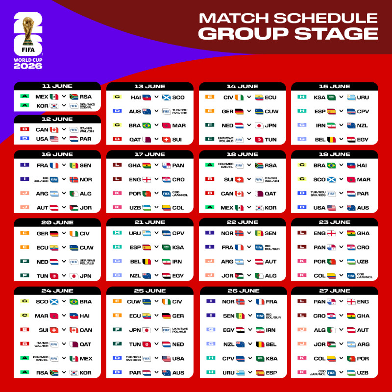 The World Cup will kick off on 11 June in Mexico and conclude on 19 July in New York. A total of 104 matches will be played across 16 venues: three in Mexico (Mexico City Stadium, Estadio Guadalajara, Estadio Monterrey), ten in the United States (Atlanta Stadium, Boston Stadium, Dallas Stadium, Houston Stadium, Kansas City Stadium, Los Angeles Stadium, Miami Stadium, New York New Jersey Stadium, Philadelphia Stadium, San Francisco Bay Area Stadium, Seattle Stadium) and two in Canada (Toronto Stadium, BC Place Vancouver).