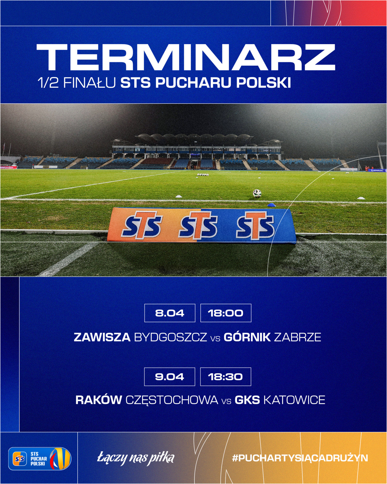 AktualnościFederacja Terminarz meczów półfinałowych STS Pucharu Polski 20 / 03 / 26 Autor: PZPN Poniżej przedstawiamy terminarz meczów półfinałowych STS Pucharu Polski w sezonie 2025/2026. Spotkania odbędą się w dniach 8 i 9 kwietnia 2026 roku.